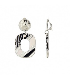 Bruin wit gestreepte oorhangers met een zilverkleurige rand. De lengte van deze oorbel is circa 3.5 cm. Voor oren met gaatjes. De oorbellen zijn nikkelvrij.