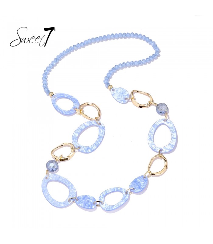 Waarom tilt deze halsketting elke look moeiteloos naar een hoger niveau? De combinatie van ijsblauw en goud geeft deze halsketting een moderne en frisse uitstraling. De speelse schakeling van transparante kralen, ovale vormen en glanzende accenten maakt dit item perfect voor wie houdt van opvallende, maar stijlvolle sieraden.