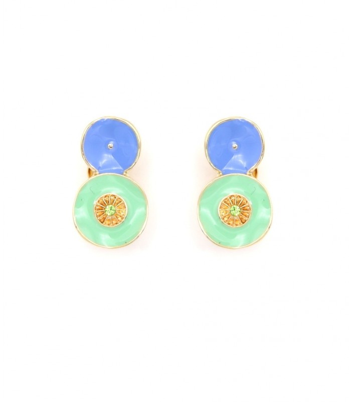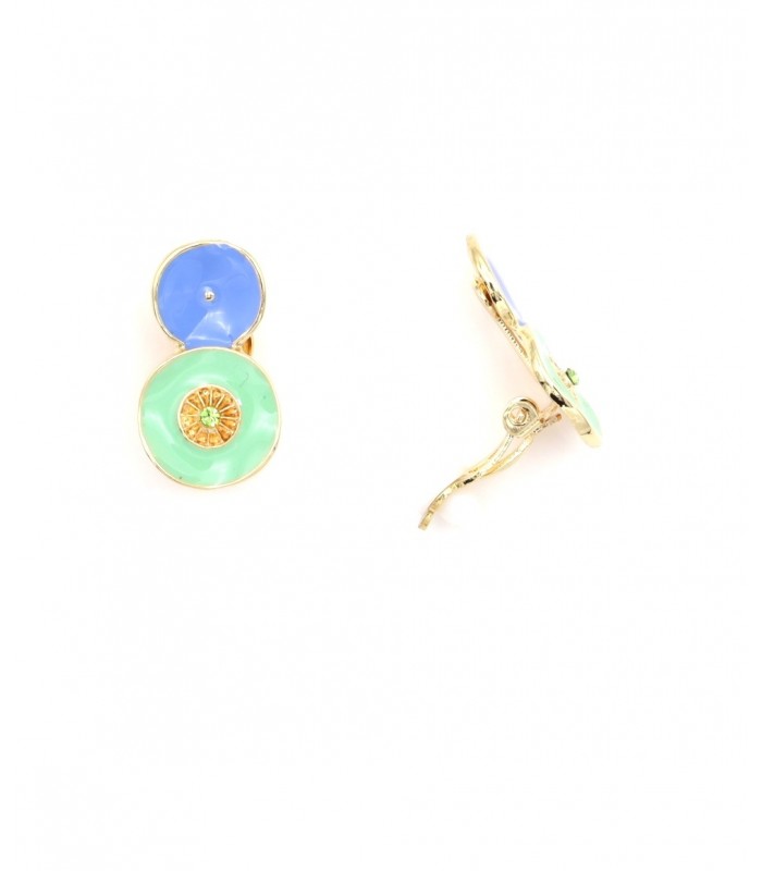 Hoe stijl je een frisse look met subtiele speelsheid? Deze oorclips combineren mintgroen met lavendelblauw in een glanzend, rond design. Het gouden midden accent met groen steentje maakt het geheel retro, maar toch eigentijds. Perfect voor een winterse of kleurrijke outfit. Vrolijke oorclips Lichtgewicht kunststof en zachte rubbertjes zorgen voor optimaal draagcomfort. Deze oorbellen zijn een stijlvolle aanvulling op elke sieradencollectie, ideaal voor wie houdt van kleur, zonder te overdrijven.