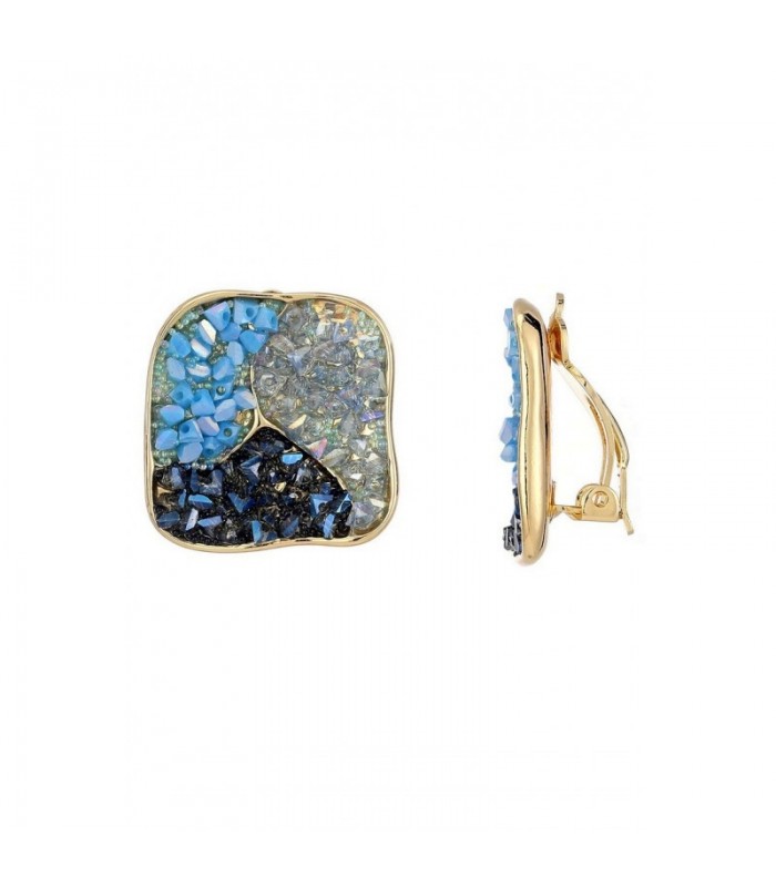 Op zoek naar oorclips die opvallen door kleur en vorm? Deze vierkante oorclips zijn versierd met een mozaiek van glinsterende steentjes in blauw, zwart en zilver. De speelse compositie in goudkleurige omlijsting maakt elke look bijzonder. Uniek design, moeiteloos draagbaar Het driedelige kleurvlak geeft diepte, terwijl het glanzende oppervlak subtiel licht vangt. Perfect voor wie houdt van uitgesproken accessoires zonder oor gaatjes. Combineer ze met een effen top of jurk voor een stijlvol accent.