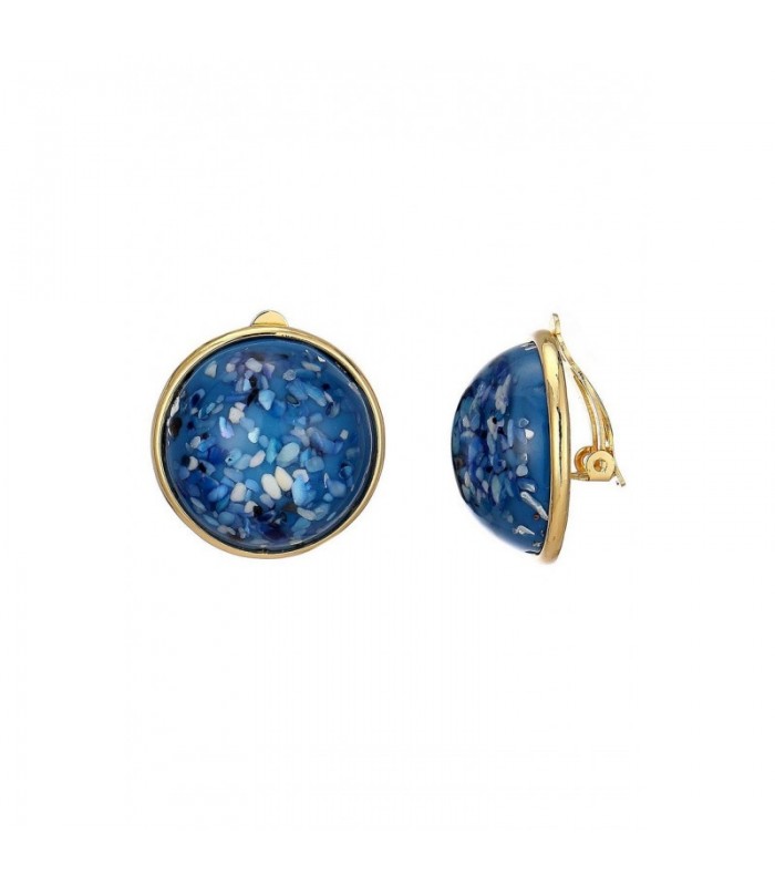 Oorclips met ronde blauwe terrazzo steen in goudkleurige zetting.