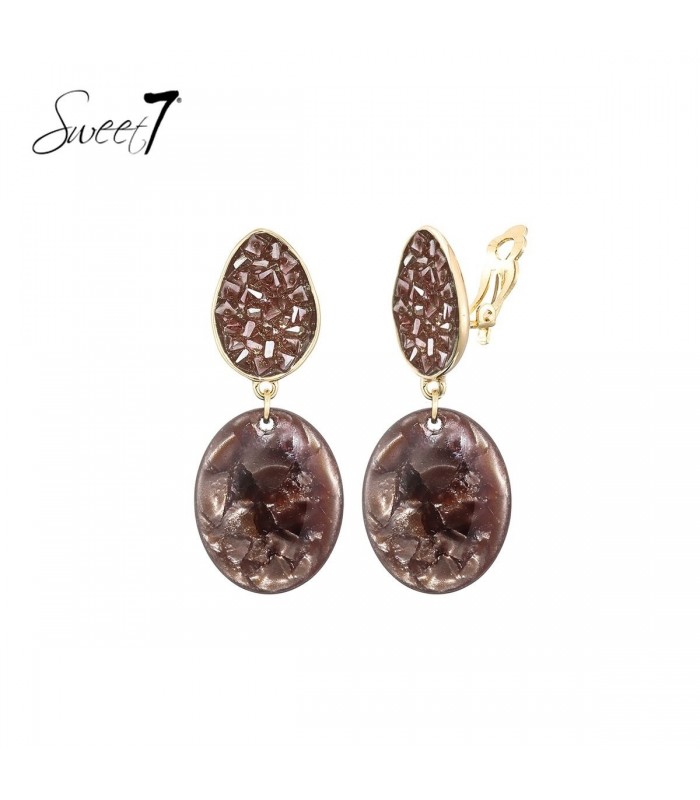 Deze bruine oorclips vormen de perfecte balans tussen natuurlijke tinten en een stijlvolle uitstraling. De ovale hanger heeft een marmerachtige glans, terwijl de bovenkant is bezet met glinsterende glas stukjes. Ideaal voor wie op zoek is naar fashion oorbellen met een warme, elegante touch.