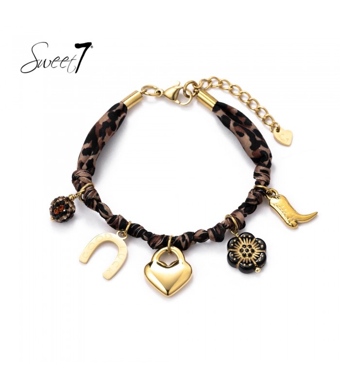 at maakt deze armband zo bijzonder? De combinatie van dieren print stof met gouden bedels vol betekenis. Van hart tot hoefijzer, elk symbool voegt karakter toe. De satijnen band zorgt voor een comfortabele luxe. Goud ontmoet boho met flair Deze fashion armband mixt speelsheid met statement. De zwarte bloem, westernlaars en glinsterende kraal brengen dynamiek, terwijl het goudkleurige slotje de look afmaakt. Ideaal als opvallend accent bij elke outfit.
