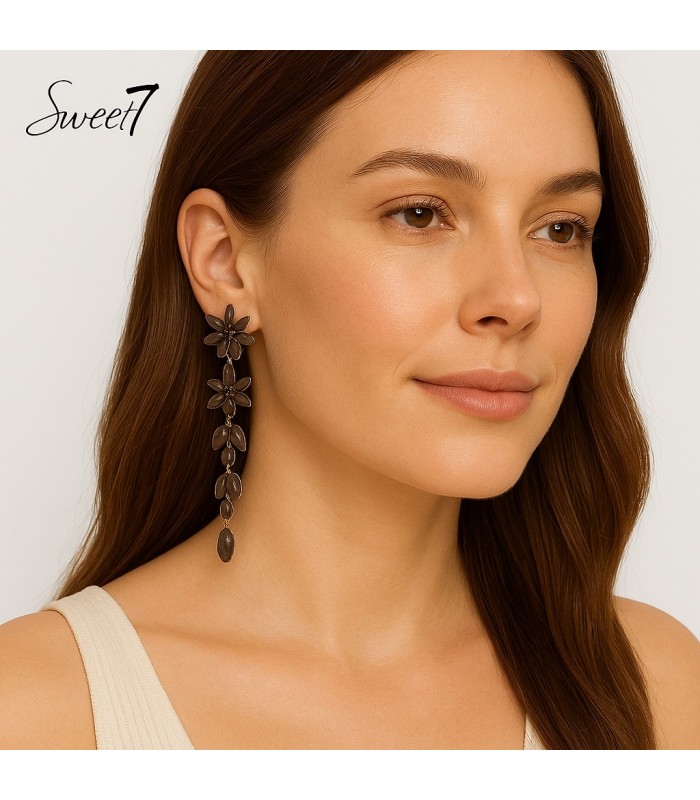 Wil je glamour met een subtiele twist? Deze oorbel straalt luxe uit dankzij de glanzende bruine kristallen in bloemvorm. De lange, sierlijke afhangende steentjes vangen het licht bij elke beweging. Ideaal voor een feest of chique diner.