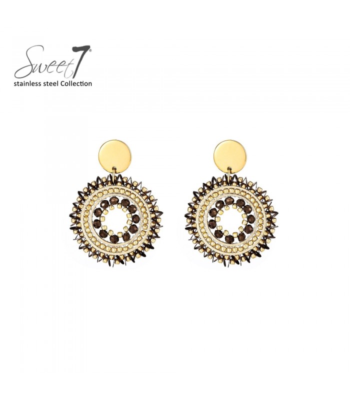 Oorbellen met bruin, gouden accenten. Hoe voeg je warmte toe aan je look met een opvallend sieraad? Deze ronde oorbellen uit de Sweet7 collectie combineren goudkleurig staal met diepe bruine kralen en een verfijnd cirkelpatroon. De contrasterende tinten zorgen voor een stijlvolle en gebalanceerde uitstraling. Oorbellen met structuur en karakter De buitenrand is afgewerkt met glanzende facetkralen in spikemodel, wat een speels lichtspel creeert bij elke beweging. Groots in effect, perfect voor wie houdt van detail met een vleugje glamour.