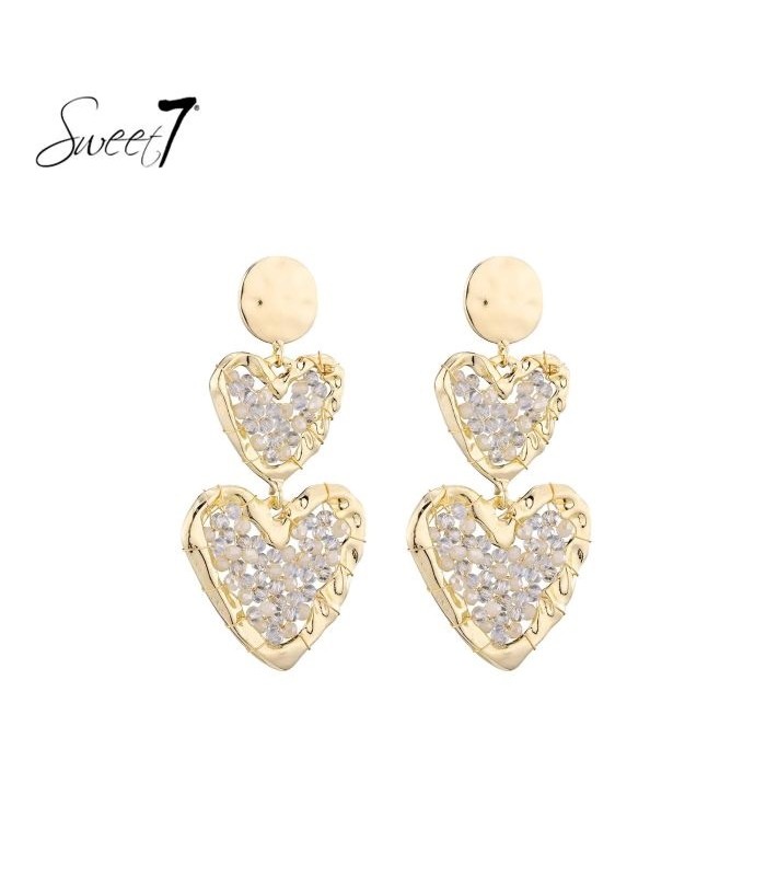 Twee harten, en een schitterende uitstraling. Op zoek naar oorbellen die romantiek en glamour samenbrengen? Deze hartvormige oorbellen van Sweet7 stralen liefde uit in elke beweging. De dubbele hartjes zijn verfijnd afgewerkt met transparante steentjes en een organisch gevormde goudkleurige rand, alsof ze met de hand gesmeed zijn uit puur gevoel.