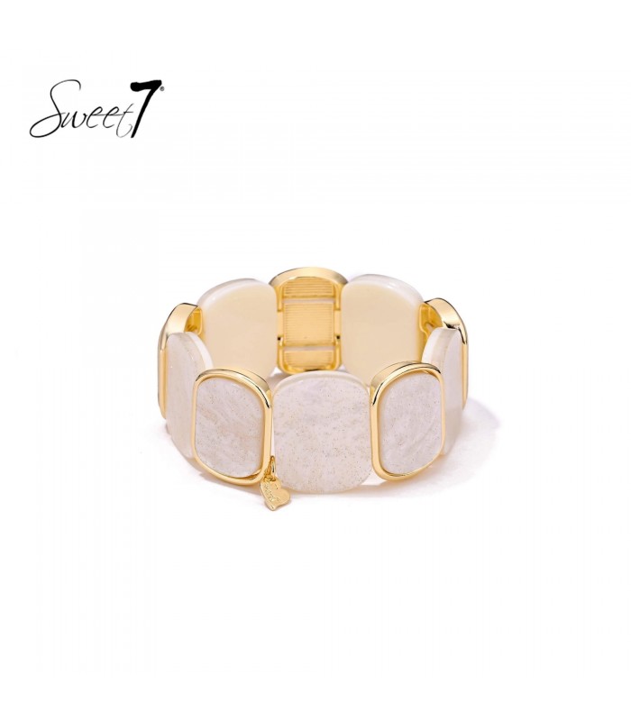 Zoek je een accessoire dat zowel elegant als moeiteloos aanvoelt? Deze armband van Sweet7 combineert zachte creme tinten met een gouden omlijsting voor een look die doet denken aan zonlicht op zandsteen. De subtiele glans en de gladde afwerking maken het een stijlvolle keuze voor elke gelegenheid, van brunch tot avondje uit.