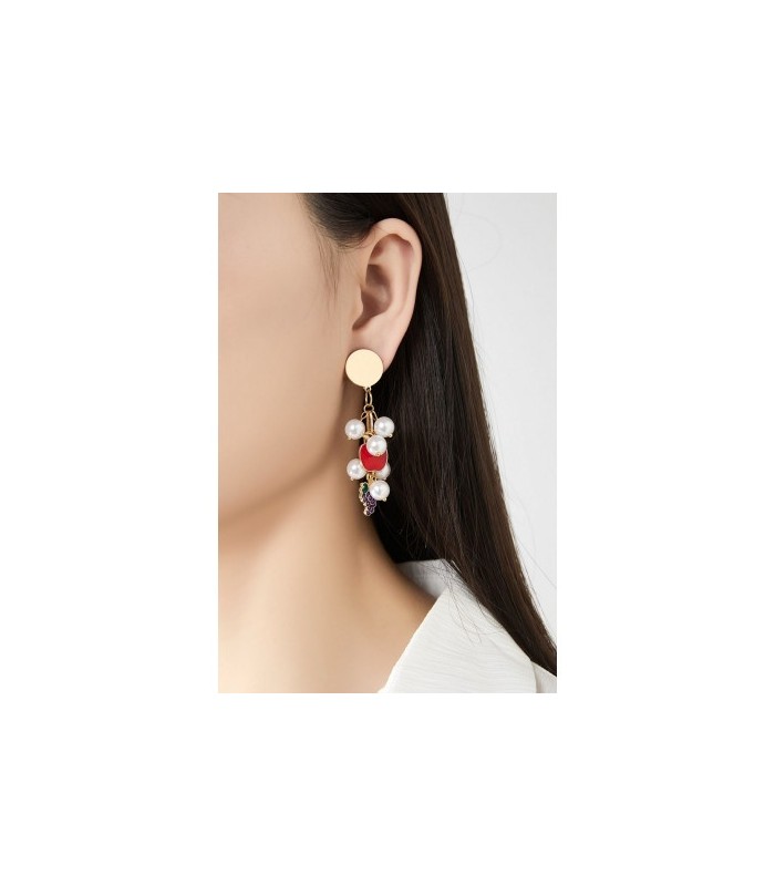 Speels fruitaccent met parelglans. Hoe combineer je fun met elegantie? Deze oorclips doen het met gemak dankzij de combinatie van witte parels, een rode appel en paarse druiven. De fruit bedels zorgen voor een vrolijk accent, terwijl de parels het geheel een verfijnde look geven. Ideaal voor wie durft te mixen. Comfort met een knipoog De speelse hangers bewegen subtiel mee bij elke stap. Goudkleurige details maken deze fashion oorbellen extra opvallend.