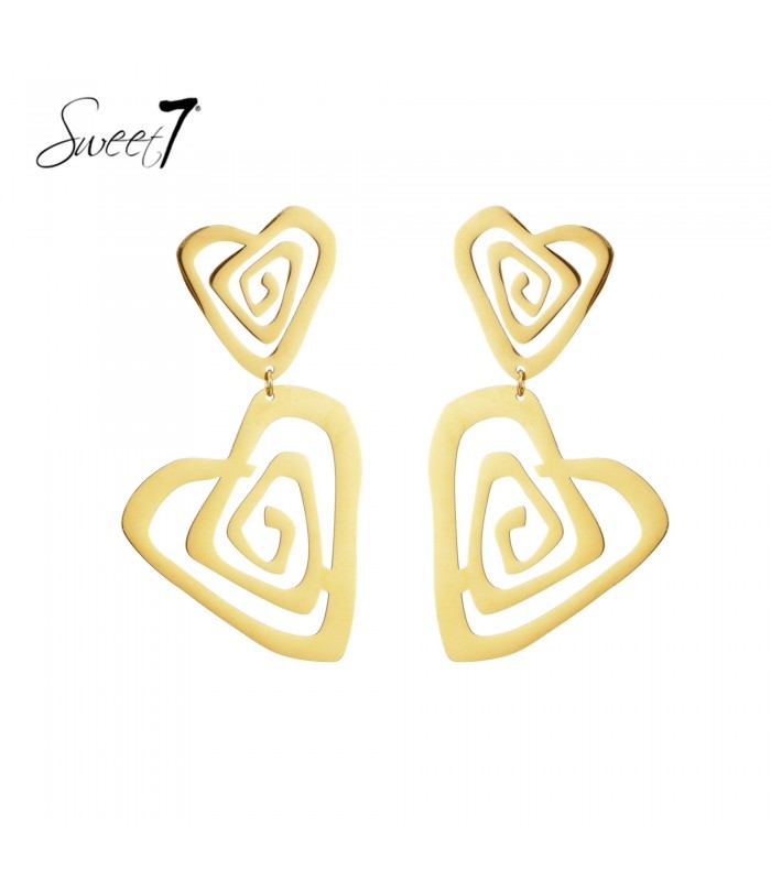 Zoek je een speels statement? Deze goudkleurige oorbellen bestaan uit twee opengewerkte harten met een spiraalvormig detail. Het bovenste hart sluit mooi aan op het oor, terwijl het grotere hart speels meebeweegt. Modern, creatief en perfect om je look kracht te geven. Oorbel met artistieke twist De geometrische lijnen en de glanzende afwerking maken deze oorbellen uniek. Ideaal voor wie houdt van opvallende sieraden die toch licht en draagbaar blijven. Combineer ze met casual outfits of draag ze als eyecatcher bij een avondlook.