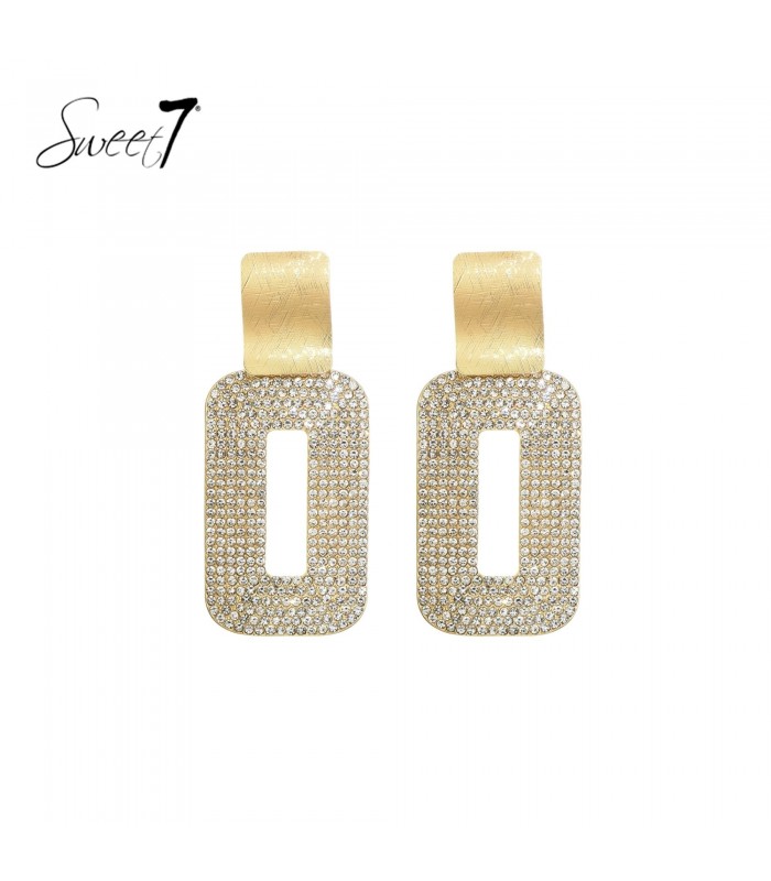 Hoe voeg je glamour toe aan je look in een beweging? Deze rechthoekige oorbellen van Sweet7 doen precies dat. De goudkleurige basis is rijkelijk bezet met fonkelende strass steentjes, waardoor je meteen een feestelijke uitstraling krijgt. Perfect voor avondlooks of als opvallend accent bij een basic outfit. Geometrisch en sprankelend in balans Het uitgesneden middenstuk en de rechte lijnen geven de oorbel een moderne, geometrische stijl. De combinatie van glans en structuur maakt dit tot een echte fashion oorbel.