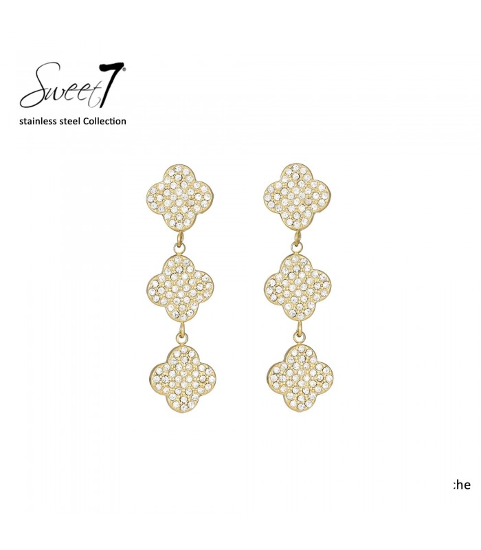 Hoe voeg je direct glamour toe aan je look? Deze oorbellen bestaan uit drie aaneengeschakelde klavervormige elementen, rijkelijk bezet met strass steentjes. De goudkleurige afwerking versterkt de luxe uitstraling perfect voor avondoutfits of een feestelijke gelegenheid. Roestvrij staal met stijl Deze oorbellen zijn gemaakt van stainless steel en behouden hun glans langdurig. Dankzij het lichte design zijn ze comfortabel om te dragen, zonder in te leveren op impact. Een echte eye-catcher binnen elke sieradencollectie.
