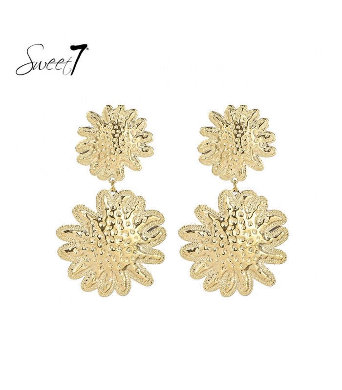 Ben je op zoek naar een opvallende oorbel die direct karakter aan je look toevoegt? Deze dubbele oorbel van Sweet7 in bloemvorm combineert organische vormen met een gehamerd afwerking. De goudkleur geeft een luxueus accent, perfect voor een fashion forward uitstraling.