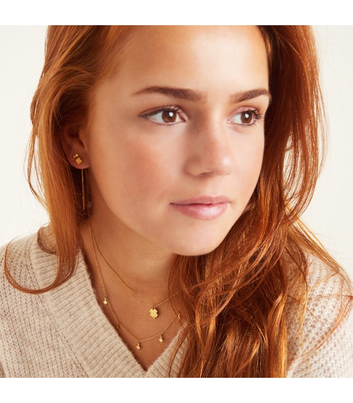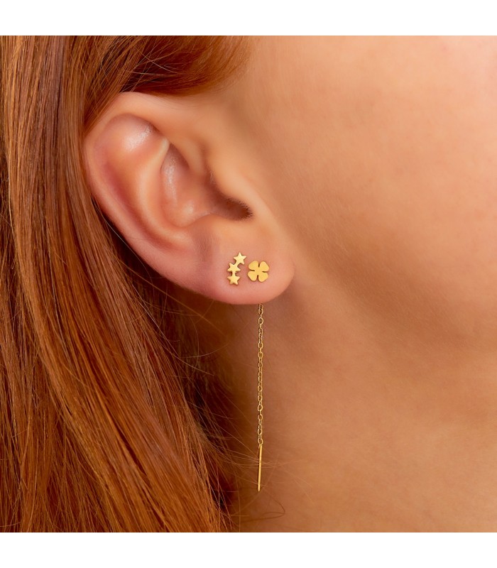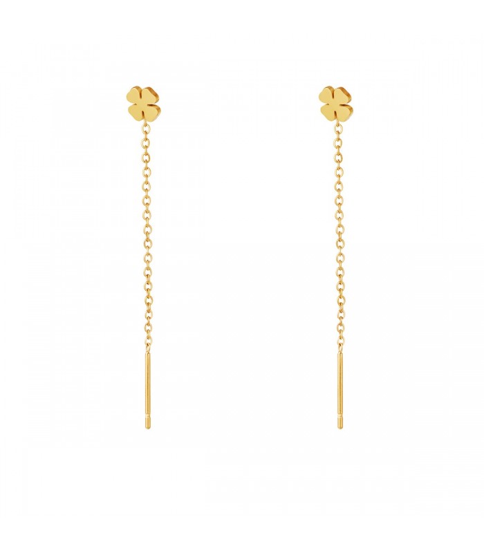 Goudkleurige hangende ketting oorbellen met een klaver bedel. Heb je een feestje, een bruiloft of wil je gewoon jezelf verwennen? Yehwang is een modern, hip en eigentijds sieraden merk. Veel glitter, zilver en goud met vaak een uitstekende afwerking zoals gold plating en gemaakt van roestvast staal. Hierdoor krijgen de oorbellen niet alleen een hippe uitstraling, maar zijn ze ook gemaakt van kwalitatief, hoogwaardig materiaal. De oorbellen zijn nikkelvrij.
