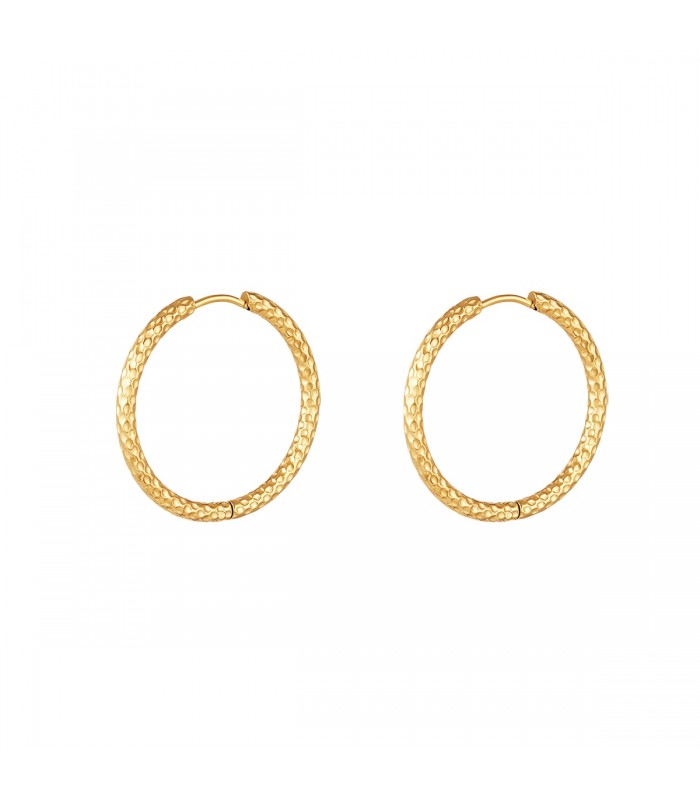 Goudkleurige oorringen met patroon medium. Heb je een feestje, een bruiloft of wil je gewoon jezelf verwennen? Yehwang is een modern, hip en eigentijds sieraden merk. Veel glitter, zilver en goud met vaak een uitstekende afwerking zoals gold plating en gemaakt van roestvast staal. Hierdoor krijgen de oorbellen niet alleen een hippe uitstraling, maar zijn ze ook gemaakt van kwalitatief, hoogwaardig materiaal. De oorbellen zijn nikkelvrij.