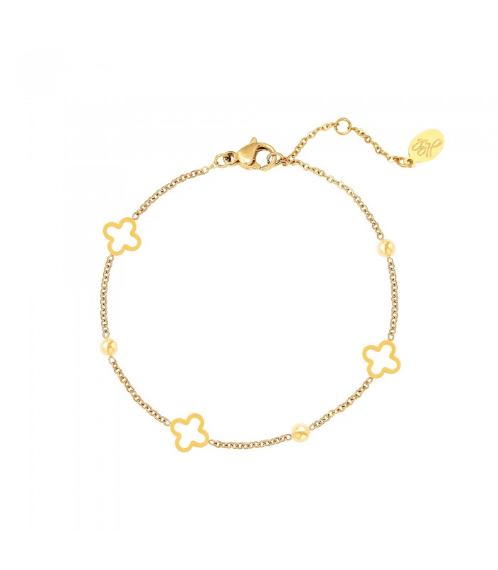 Goudkleurige armband met kleine open klavertjes. Heb je een feestje, een bruiloft of wil je gewoon jezelf verwennen? Yehwang is een modern, hip en eigentijds sieraden merk. Veel glitter, zilver en goud met vaak een uitstekende afwerking zoals gold plating of Rhodium en gemaakt van roestvast staal. Hierdoor krijgen de armbanden niet alleen een hippe uitstraling, maar zijn ze ook gemaakt van kwalitatief, hoogwaardig materiaal. Armbanden met een vaste lengte hebben vaak een sluiting met verlengkettinkje.