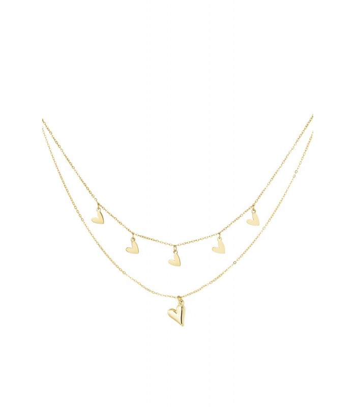 Goudkleurige dubbele halsketting met als bedels hartjes. Trendy goudkleurige dubbele halsketting verrijkt met elegante hartjes bedels. Dit stijlvolle sieraad vangt de essentie van hedendaagse mode en voegt een sprankje liefde toe aan elke outfit. Perfect voor elke gelegenheid, van casual dagjes uit tot avondjes uit. Onze dubbele halsketting is niet alleen een fashion statement, maar ook een symbool van liefde en verbondenheid. Draag het als een dagelijks accessoire of geef het cadeau aan een speciaal iemand. Met zijn verstelbare lengte past het bij elke stijl. Waar wacht je nog op? Voeg dit must-have sieraad toe aan je collectie