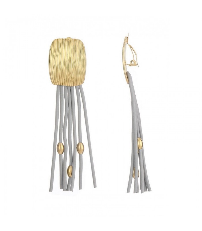 Statement met soepele lijnen. Hoe combineer je structuur met beweging? Deze opvallende oorclips doen het met gemak. De gebogen, geribbelde clip in goudkleur vormt een krachtig basisaccent, terwijl de lange grijze strengen met gouden kralen zorgen voor ritme en elegantie. Licht en opvallend Dankzij het gebruik van soepel materiaal blijven deze oorclips licht om te dragen, ondanks hun lengte. De matte grijstinten contrasteren prachtig met het glanzende goud. Een must have voor wie houdt van artistieke fashion oorbellen met impact.