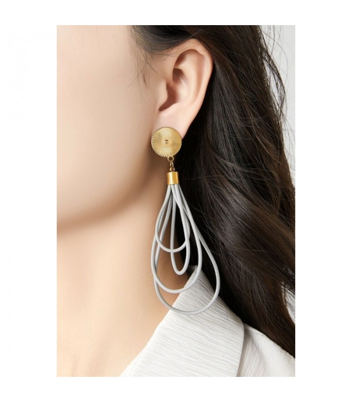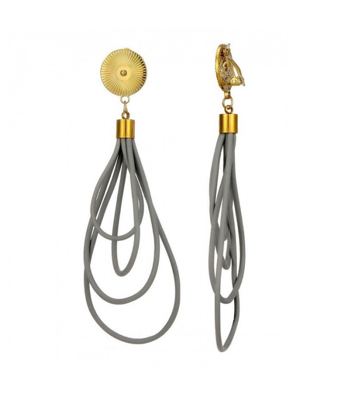 Wil je lengte en beweging zonder klassiek te ogen? Deze oorclips combineren goudkleurige details met grijze lussen in een vloeiend, modern ontwerp. Het resultaat is een lichte, speelse oorbel met een opvallend silhouet en eigentijdse uitstraling. Grafisch en lichtgewicht De zachte, rubberachtige lussen zorgen voor comfort en flair. De gouden clip met relief geeft een subtiele retro touch. Perfect voor een modieuze look met een creatieve twist van casual chic tot avondstijl