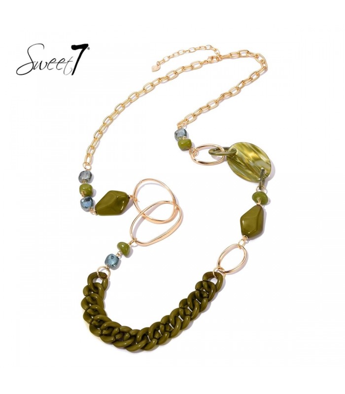 Hoe breng je een natuurlijke tint samen met moderne elegantie? Deze halsketting in olijfgroen met goudkleurige schakels is het antwoord. De grove schakel, kralen en glanzende elementen zorgen voor een speelse balans. Een trendy ketting die elke outfit direct opwaardeert.