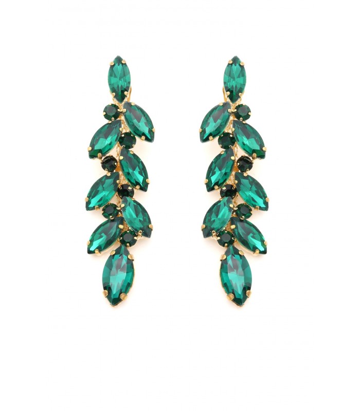 Hoe trek je moeiteloos alle aandacht? Deze oorclips stralen luxe uit met groene stenen in een elegante bladvorm. De gouden zetting versterkt de diepe kleur en maakt dit ontwerp perfect voor feestelijke looks of een chique diner-outfit. Comfort zonder compromis De clip on sluiting zit stevig en comfortabel, zelfs zonder gaatjes. Door het design draag je deze fashion oorbellen met gemak. Ideaal voor wie wil opvallen met klasse en zonder concessies.