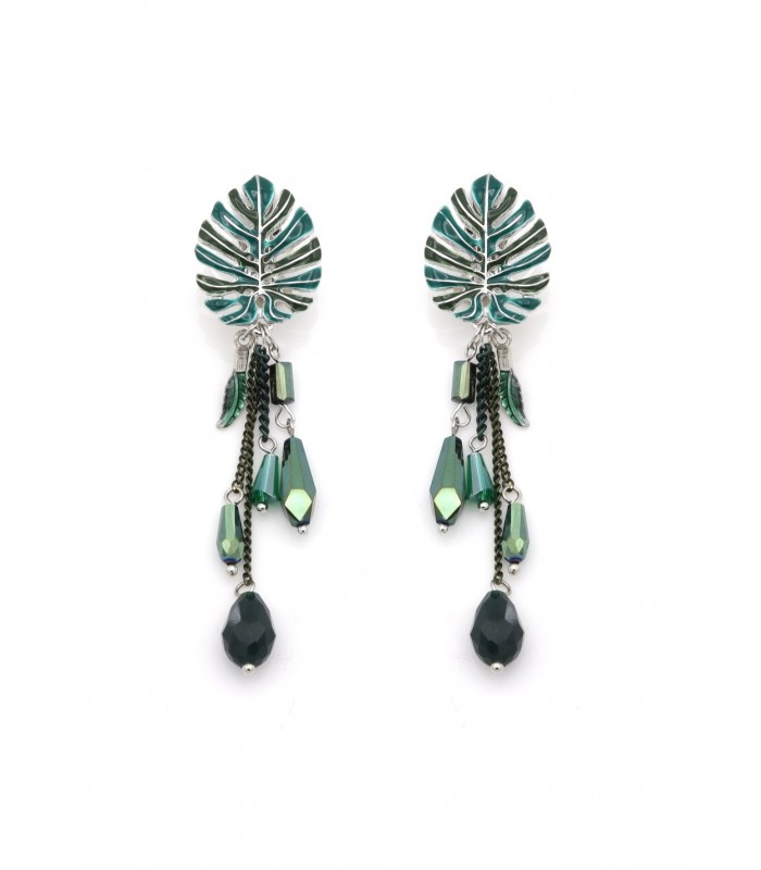Oorclips met groen blad en kristal hangers aan een kettinkje