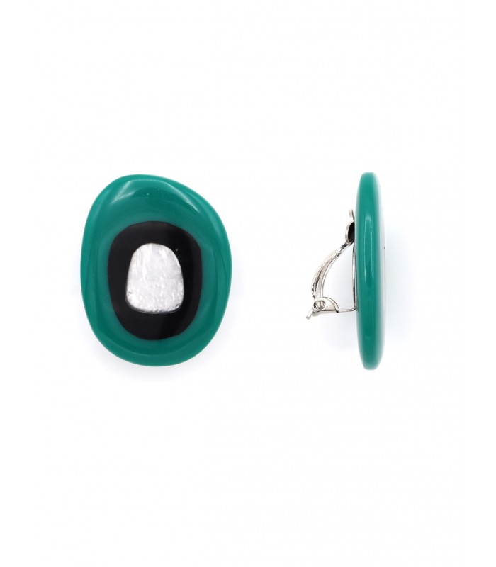 Hoe geef je jouw outfit direct een grafische boost? Deze oorclips combineren groen met zwart en een glanzend zilverkleurig accent in een abstract ovaal design. Ideaal voor liefhebbers van statement oorclips en vintage geinspireerde sieraden.