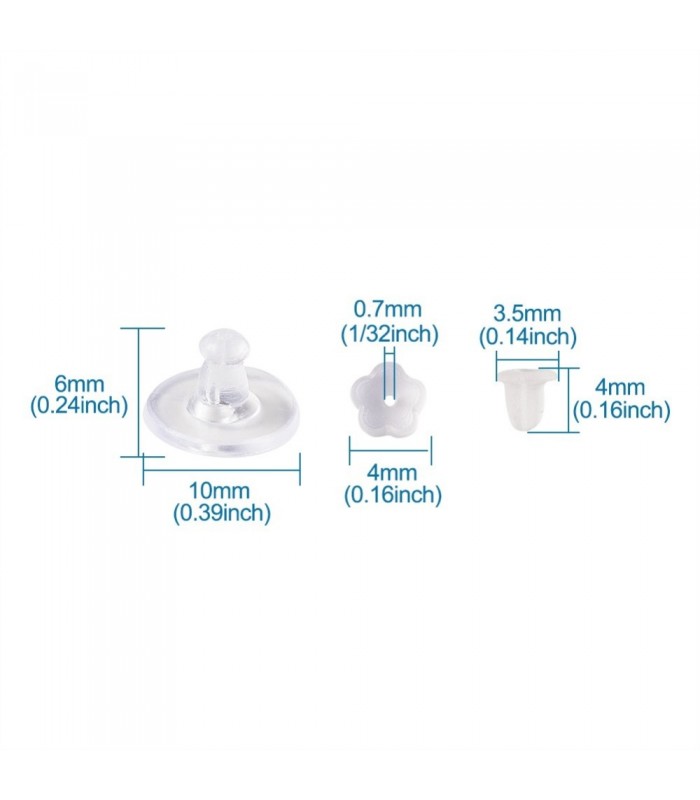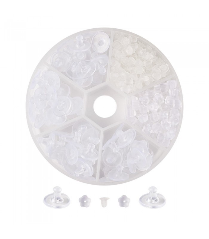 Doosje met drie soorten oorbellen rubbertjes, geschikt voor zowel oorhangers (haakje) als ook oorstekers. Inhoud van het handig hersluitbaar doosje is circa: Oorbelrubbertje, stoppertjes: 4x3.5x3.5mm, gat: 0.7mm, 170 stuks Oorbelrubbertje, stoppertjes: 6x10mm, gat: 0.5mm, 80 stuks Oorbelrubbertje, stoppertjes: 4x2.5mm, gat: 0.7mm, 90 stuks.