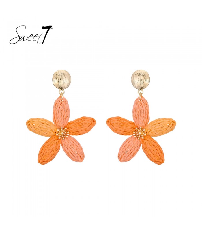 Sweet7 oorbellen zijn een echte ode aan zomerse elegantie. De opvallende bloemvorm, opgebouwd uit vijf verfijnde bloemblaadjes in een warme perzik-oranje tint, geeft de oorbel een speelse maar stijlvolle uitstraling. De licht gekreukte textuur van de blaadjes zorgt voor diepte en een ambachtelijk karakter, alsof elke bloem met de hand is gevormd.