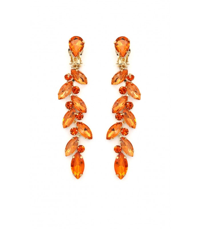 Deze oorclips zijn opvallend en elegant vormgegeven met oranje, bladvormige kristallen die in een vloeiende verticale lijn zijn geplaatst. De stenen hebben een marquise slijpvorm, wat zorgt voor een luxe uitstraling en een schitterend lichtspel bij beweging. Tussen de grotere kristallen zijn kleinere ronde oranje steentjes verwerkt voor extra glans en diepte. De oorclips zijn goudkleurig afgewerkt, wat de warme toon van de oranje stenen versterkt. Dankzij het clipmechanisme zijn ze comfortabel te dragen zonder gaatjes in de oren.