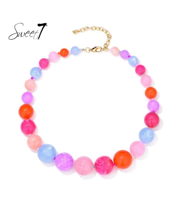 Kleurenfeest rond je hals. Hoe breng je direct vrolijkheid in je outfit? Deze halsketting van Sweet7 is pure kleurentherapie. De grote glanzende kralen in tinten roze, paars, rood, oranje en blauw creeren een speels ritme dat meteen opvalt. Elk kraaltje lijkt een eigen karakter te hebben, samen vormen ze een ketting vol levendigheid en optimisme.