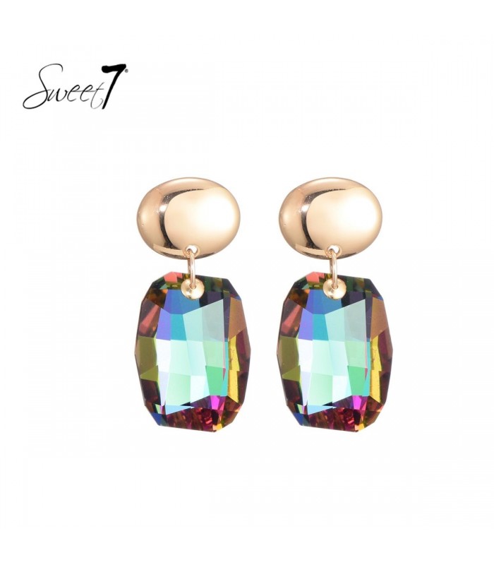 Hoe breng je leven in je look met een sieraad? Deze oorbellen vangen elke lichtstraal in een regenboog van kleuren. De facetgeslepen steen reflecteert groen, paars en goud perfect voor wie durft te stralen.