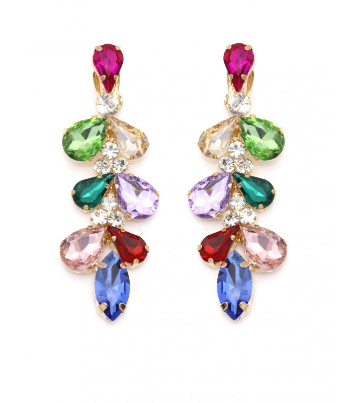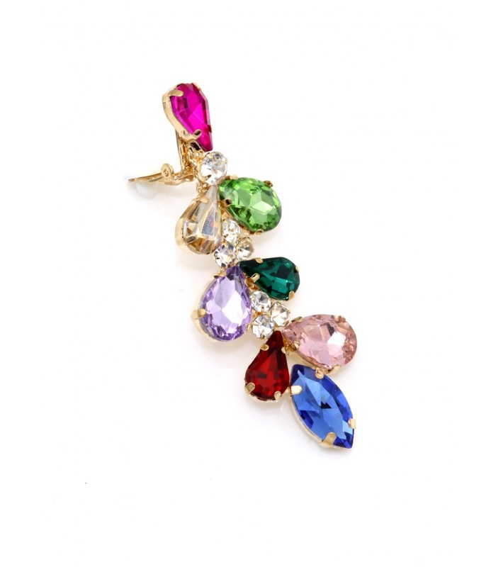 Kleur die spreekt. p zoek naar oorclips die direct de aandacht trekken? Deze kleurrijke oorclips zijn een explosie van glans en stijl. Elke steen is zorgvuldig gezet in een goudkleurige basis, waardoor de kleuren nog levendiger lijken. Een echte eyecatcher voor wie durft te stralen. Elegant en expressief De combinatie van rode, paarse, groene en blauwe kristallen maakt deze oorclips ideaal voor een avondlook of feestelijke gelegenheid. Door de stevige clip blijven ze perfect zitten, ook zonder gaatjes. Maak van elk moment een fashion statement.