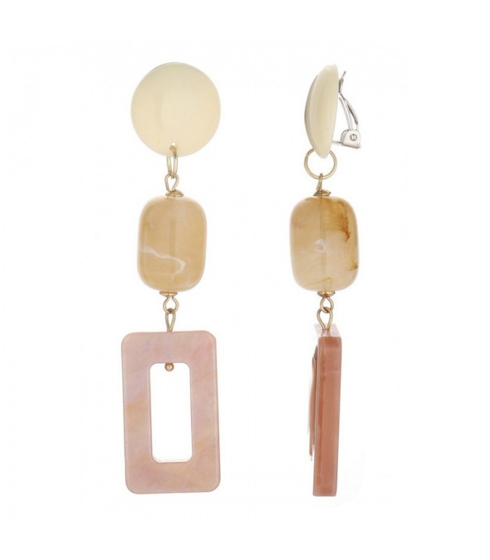Op zoek naar een elegante kleurcombinatie? Deze oorclips hebben een glanzende beige knop, een warme honingkleurige kraal en een open rechthoekige hanger in zachtroze marmerlook. Een verfijnde keuze voor elke gelegenheid. Moderne vormen. De combinatie van natuurlijke tinten en strakke lijnen geeft deze oorbellen een stijlvolle, minimalistische uitstraling. Ideaal voor zowel dagelijks gebruik als een chique avondlook.
