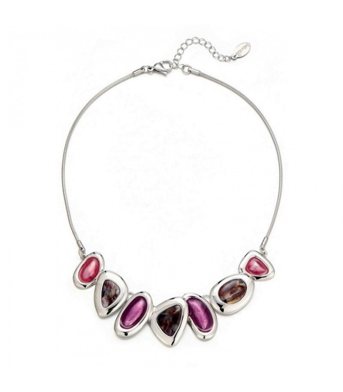 Wil je kleur toevoegen aan je look zonder in te boeten op stijl? Deze halsketting speelt met tinten roze, paars in speels gevormde elementen. De zilverkleurige omlijsting geeft het geheel een moderne, gepolijste uitstraling. Organisch en opvallend De asymmetrische vormen zorgen voor een natuurlijke flow, terwijl de glanzende afwerking een luxe touch biedt. Ideaal bij zowel effen tops als feestelijke jurken. Een must-have voor wie houdt van kleurrijke kettingen en fashion sieraden.