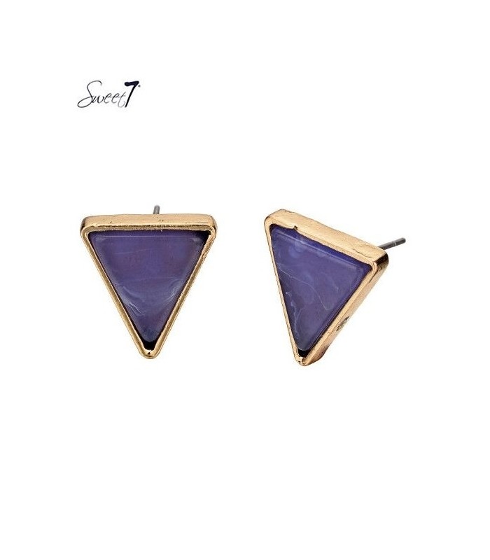 Paarse oorbellen in de vorm van een driehoek en een goudkleurige rand. Heb je een feestje, een bruiloft of wil je gewoon jezelf verwennen? Sweet7 is een modern, hip en eigentijds sieraden merk. Veel inspiratie wordt gehaald uit natuurlijke materialen, zoals leer en halfedelstenen. Hierdoor krijgen de oorbellen niet alleen een hippe uitstraling, maar zijn ze ook gemaakt van kwalitatief, hoogwaardig materiaal. De oorbellen zijn nikkelvrij en worden voorzien van stoppertjes, zodat je ze comfortabel kan dragen en niet uit de oren glijden.