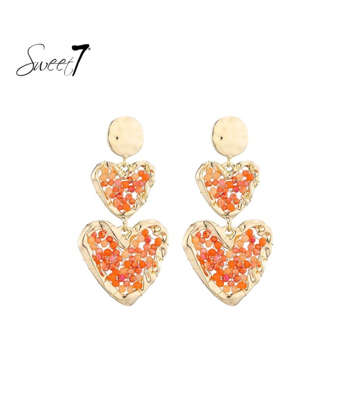 Oorbellen met rood, oranje kralen en goudkleurige hartvorm