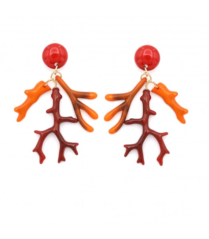 Deze opvallende oorclips zijn geinspireerd op speelse koraalvormen in warme rood- en oranjetinten. De bovenkant bestaat uit een glanzende ronde clip in dieprood, waaraan meerdere takvormige hangers bevestigd zijn. De mix van tinten geeft een kleurrijke, zomerse uitstraling die perfect past bij een vrolijke outfit, strandlook of een statement accessoire moment.