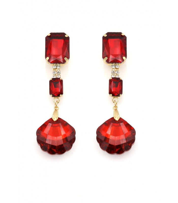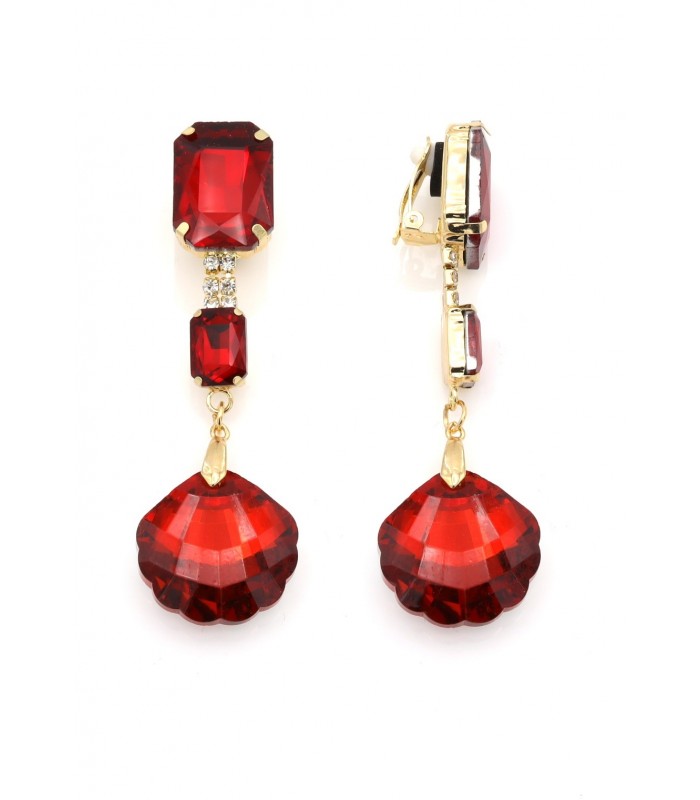 Oorclips met rode hanger. Deze oorbel speelt met licht en beweging. Bovenaan fonkelen rode stenen en kleine kristallen. Onderaan hangt een opvallende rode hanger in schelpvorm. De oorbellen geven elke outfit een trendy avondstijl met een vleugje vintage glamour.