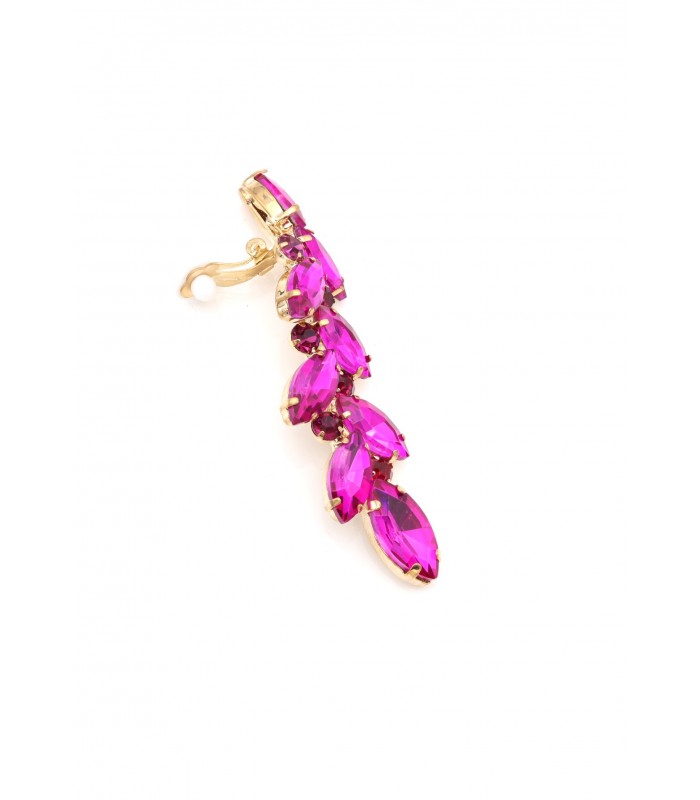 Roze met gouden glamour. Deze oorclips zijn opvallend en elegant vormgegeven met felroze, bladvormige kristallen die in een vloeiende verticale lijn zijn geplaatst. De stenen hebben een marquise slijpvorm, wat zorgt voor een luxe uitstraling en een schitterend lichtspel bij beweging. Tussen de grotere kristallen zijn kleinere ronde roze steentjes verwerkt voor extra glans en diepte. De oorclips zijn goudkleurig afgewerkt, wat de warme toon van de roze stenen versterkt. Dankzij het clipmechanisme zijn ze comfortabel te dragen zonder gaatjes in de oren.
