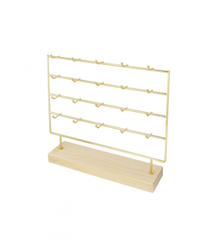 Wil je jouw sieraden overzichtelijk en stijlvol bewaren? Dit sieradenrek combineert een minimalistisch design met een moderne uitstraling. De gouden stangstructuur in combinatie met een houten voet maakt het een subtiele eyecatcher op je kaptafel of dressoir. Perfect om je favoriete oorbellen, armbanden of kettingen netjes op te hangen.
