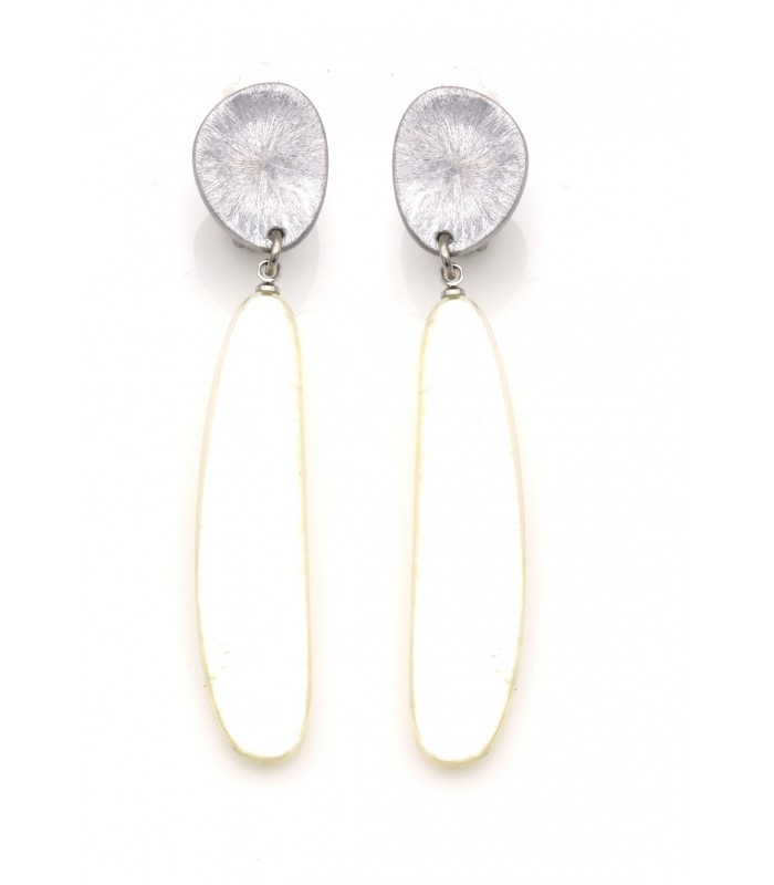 Zoek je oorclips die lengte en verfijning toevoegen aan je look? Deze zilverkleurige oorclips combineren een matte, ronde bovenkant met een langwerpig wit hangend element. Een stijlvol ontwerp dat moeiteloos een moderne uitstraling geeft. Tijdloos en comfortabel De neutrale kleuren maken deze oorbellen ideaal voor zowel dagelijks gebruik als feestelijke gelegenheden. Dankzij de zachte rubber pads zitten ze stevig en comfortabel, zonder dat je gaatjes nodig hebt.