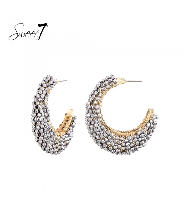 Deze halfronde oorbellen van Sweet7 combineren zilverkleurige glaskralen met een gouden basis voor een krachtig contrast. De glans van de kralen geeft een feestelijke touch, terwijl het ontwerp elegant en modern blijft. Perfect voor wie zoekt naar opvallende fashion oorbellen met klasse. Strak design met luxe afwerking De kralen zijn rondom met gouden draad verweven, wat zorgt voor een handgemaakte uitstraling. Deze oorbel is een echte eyecatcher bij feestkleding, maar ook stijlvol bij een casual outfit. Ze combineren perfect met andere statement oorbellen en sieraden.