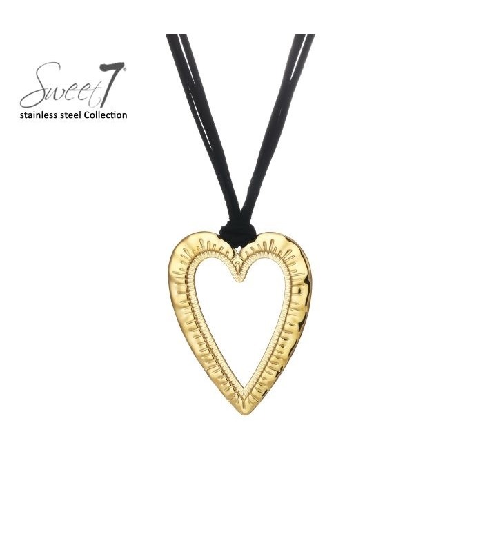 Hoe geef je een casual outfit direct karakter? Deze halsketting van Sweet7 combineert een opengewerkt hart in goudkleurig stainless steel met een zwart, koord. De asymmetrische hartvorm geeft een speelse twist, terwijl de textuur in het metaal zorgt voor een eigentijdse uitstraling. Minimalistisch, maar met impact. Licht en veelzijdig De verstelbare sluiting maakt deze halsketting geschikt voor elke halslijn. Draag m solo voor een subtiel statement of met andere kettingen. Populaire zoektermen als gouden ketting dames en zwarte koord ketting sluiten naadloos aan op dit trendy ontwerp.
