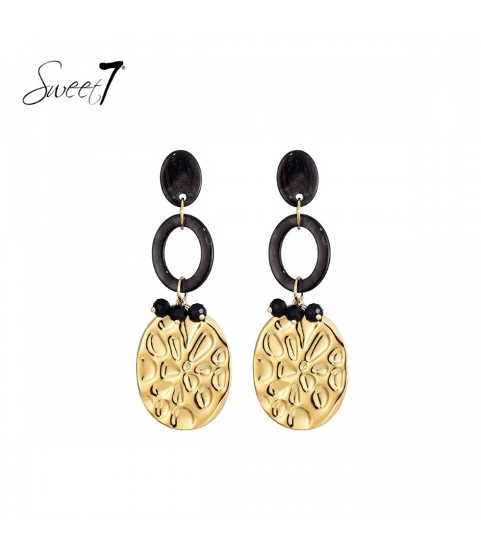 Wil je iets dragen dat zowel krachtig als verfijnd oogt? Deze oorbellen van Sweet7 combineren een diepe zwarte marmerlook met een glanzende, goudkleurige hanger. De subtiele zwarte kraaltjes boven de ovale plaat zorgen voor een speelse touch met een luxe uitstraling. Tijdloos met een moderne twist De combinatie van zwart en goud maakt deze oorbellen tot een must have accessoire voor zowel overdag als s avonds. Perfect bij een zwarte jurk of juist als opvallend accent bij een basic outfit. Ideaal voor liefhebbers van statement oorbellen en goudkleurige sieraden.