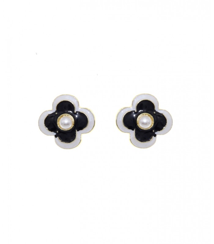 Zwarte bloemen oorclips met een creme rand en een pareltje
